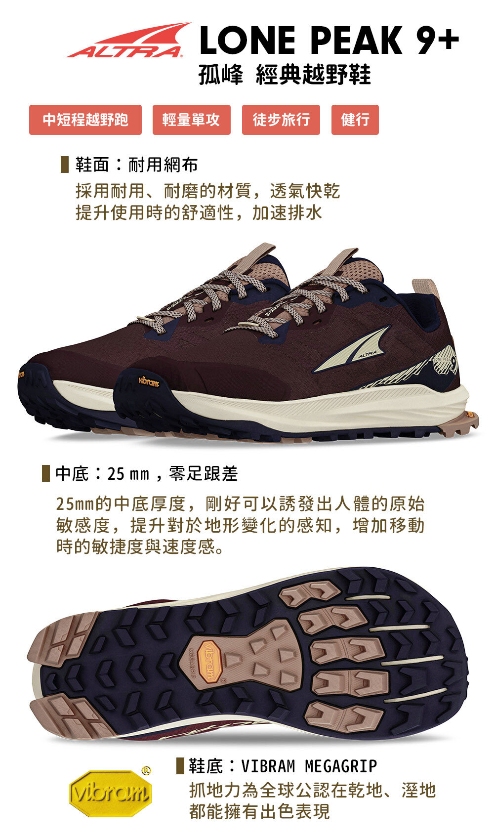 ALTRA 最經典的越野跑鞋LONE PEAK 迎來重大的升級,在LONE PEAK 9+ 上與以往不同,採用了VIBRAM 知名的MEGAGRIP 鞋底,其抓地力為全球公認在乾地、溼地都能擁有出色表現。