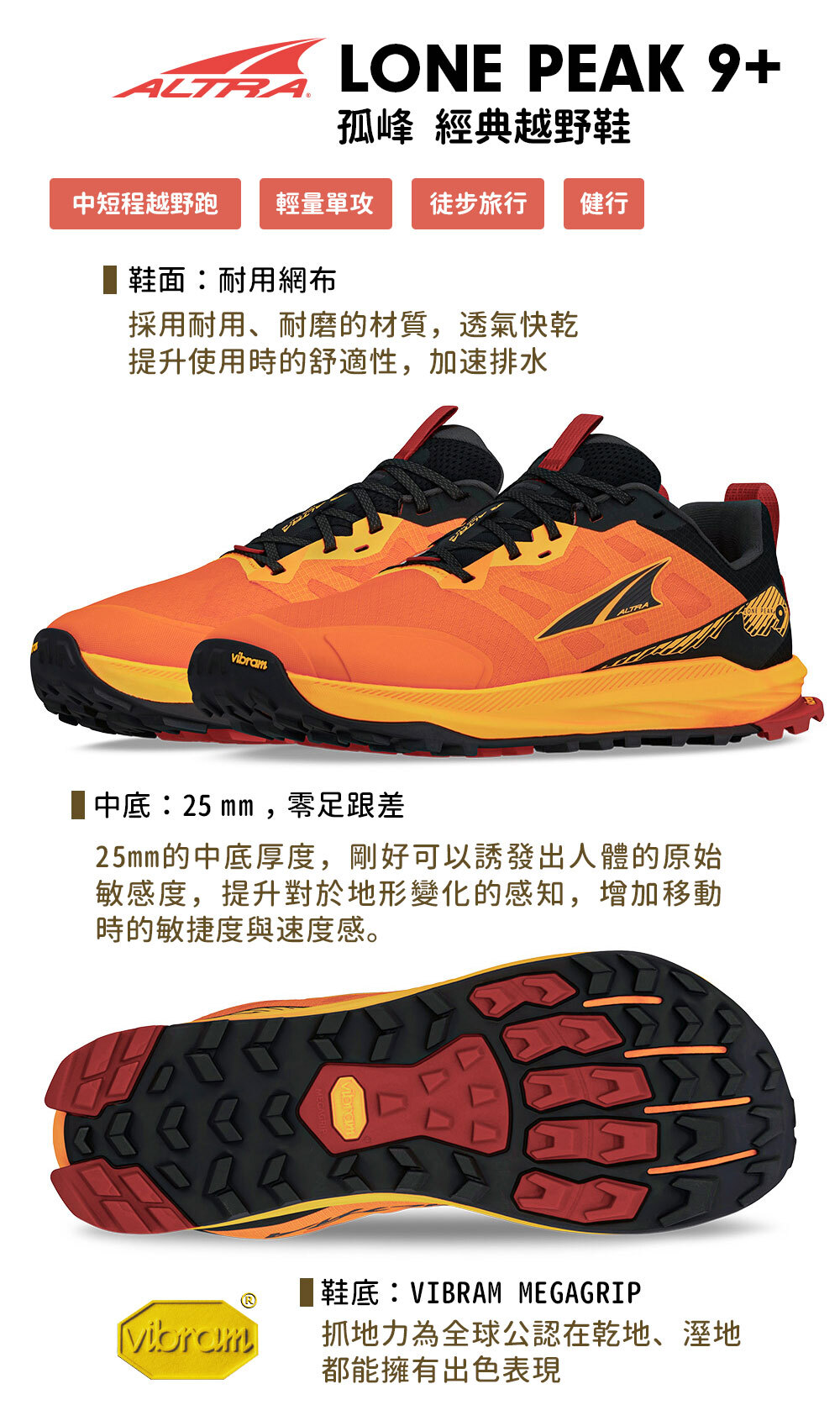 ALTRA 最經典的越野跑鞋LONE PEAK 迎來重大的升級,在LONE PEAK 9+ 上與以往不同,採用了VIBRAM 知名的MEGAGRIP 鞋底,其抓地力為全球公認在乾地、溼地都能擁有出色表現。
