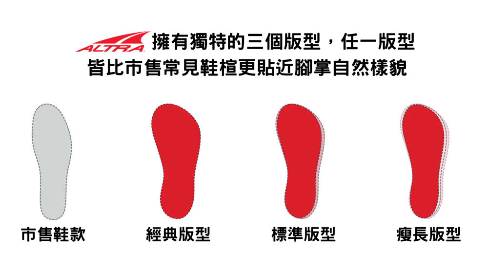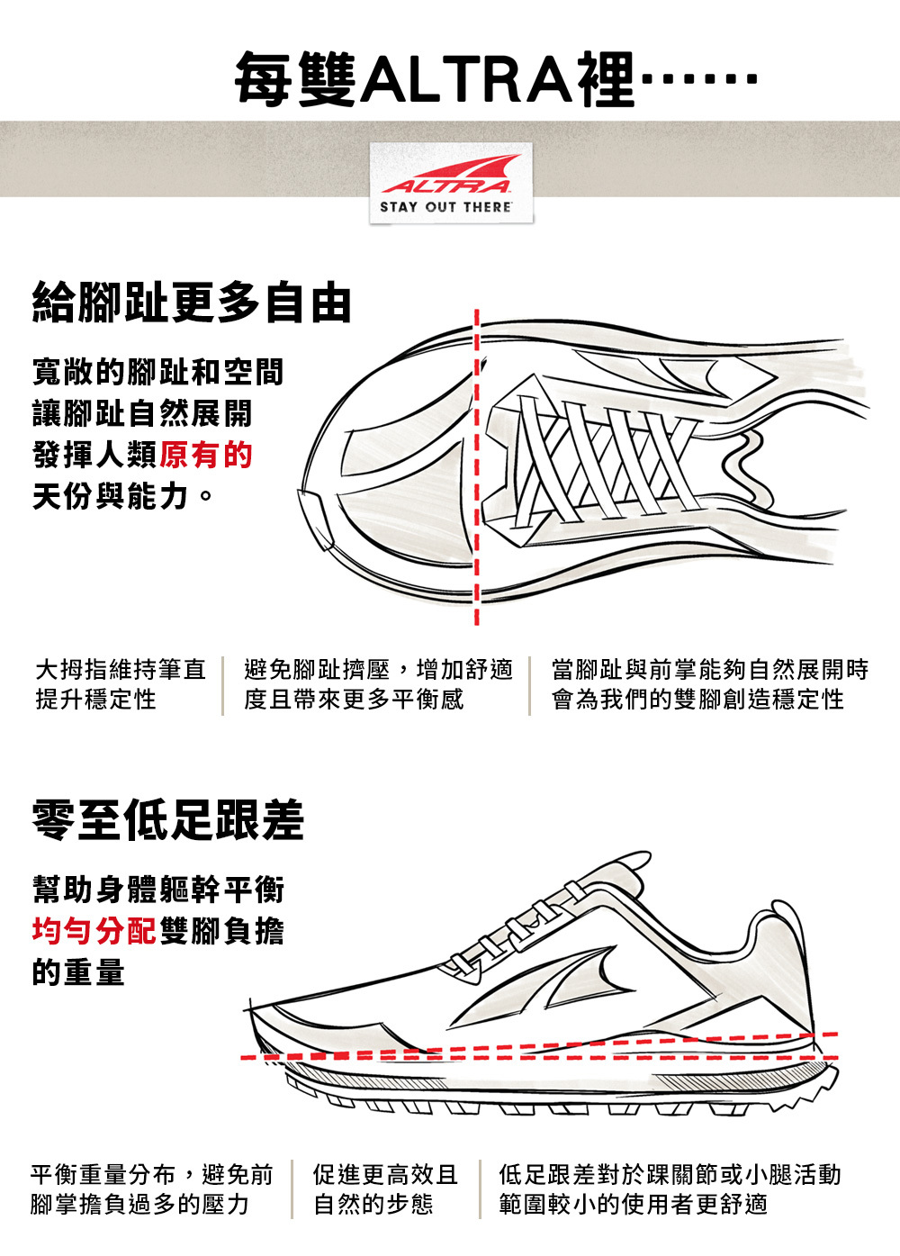 ALTRA 的兩大設計核心概念分別為Zero-to-low drop (零至低足跟差)、Roomy Toe Box(自然鞋楦),前者提倡鞋底從腳跟到前掌的高度一致或是落差小於4mm,幫助跑者維持自然的跑步姿勢,降低膝蓋和關節的壓力,而低足跟差的款式也可以做為「過渡鞋」,逐漸找回自然的步行姿態(0mm drop)。Roomy Toe Box 的概念其實相當簡單,寬大的鞋楦設計,把應有的鞋內空間歸還給使用者,避免足部擠壓受傷,允許腳趾自然舒展,增強穩定性和舒適性,特別適合長時間跑步或日常使用。