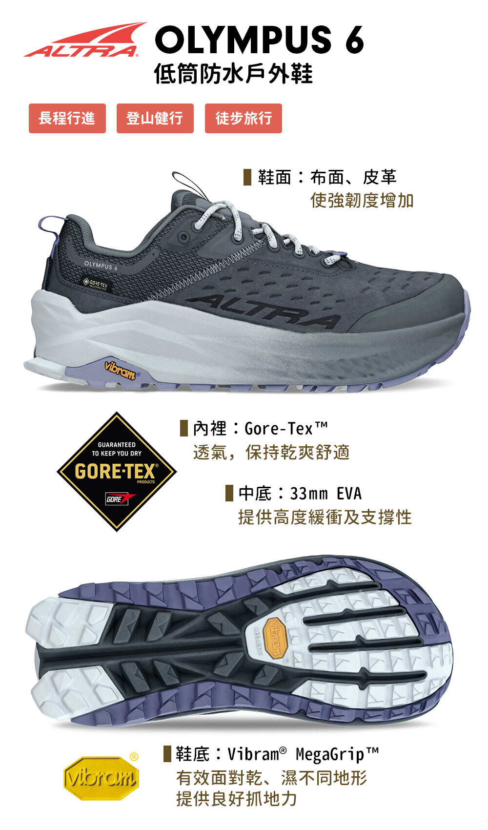 ALTRA 以眾多越野跑鞋聞名,近幾年跨足健行登山領域,以旗艦款越野鞋OLYMPUS 系列為基底,推出防水戶外鞋款。相較於前一代,OLYMPUS 6 HIKE LOW GTX 調整了鞋領、鞋跟杯的設計,為的是給予更加安定的包覆感;更新鞋底齒痕排序使耐久度增加。同時,延續前一代的配置,鞋面使用了皮革材質,使強韌度增加;GORE-TEX 防水膜的應用,確保了雙腳在活動期間可以保持乾燥;根據全球知名的鞋底專家Vibram®,Vibram® Megagrip 鞋底是一款可以同時於潮濕和乾燥的地形上提供無與倫比的抓地力。