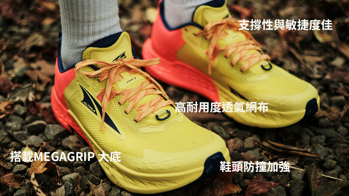 TIMP 系列迎來VIBRAM MEGAGRIP 大底,鞋體重量輕,包覆性高,適合中長程以上的越野競賽,平時訓練、登山健行也絕對沒問題,帶給你更敏捷、靈活的移動感受。